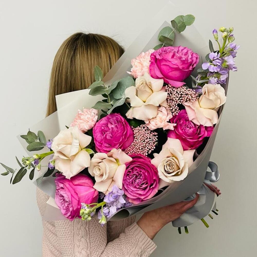 Роза Эквадор – 5 шт.Роза – 6 шт.Озотамнус – 2 шт.Диантус – 3 шт.Маттиола – 3 шт.Эвкалипт – 3 шт.Упаковка дизайнерская – 3 шт.