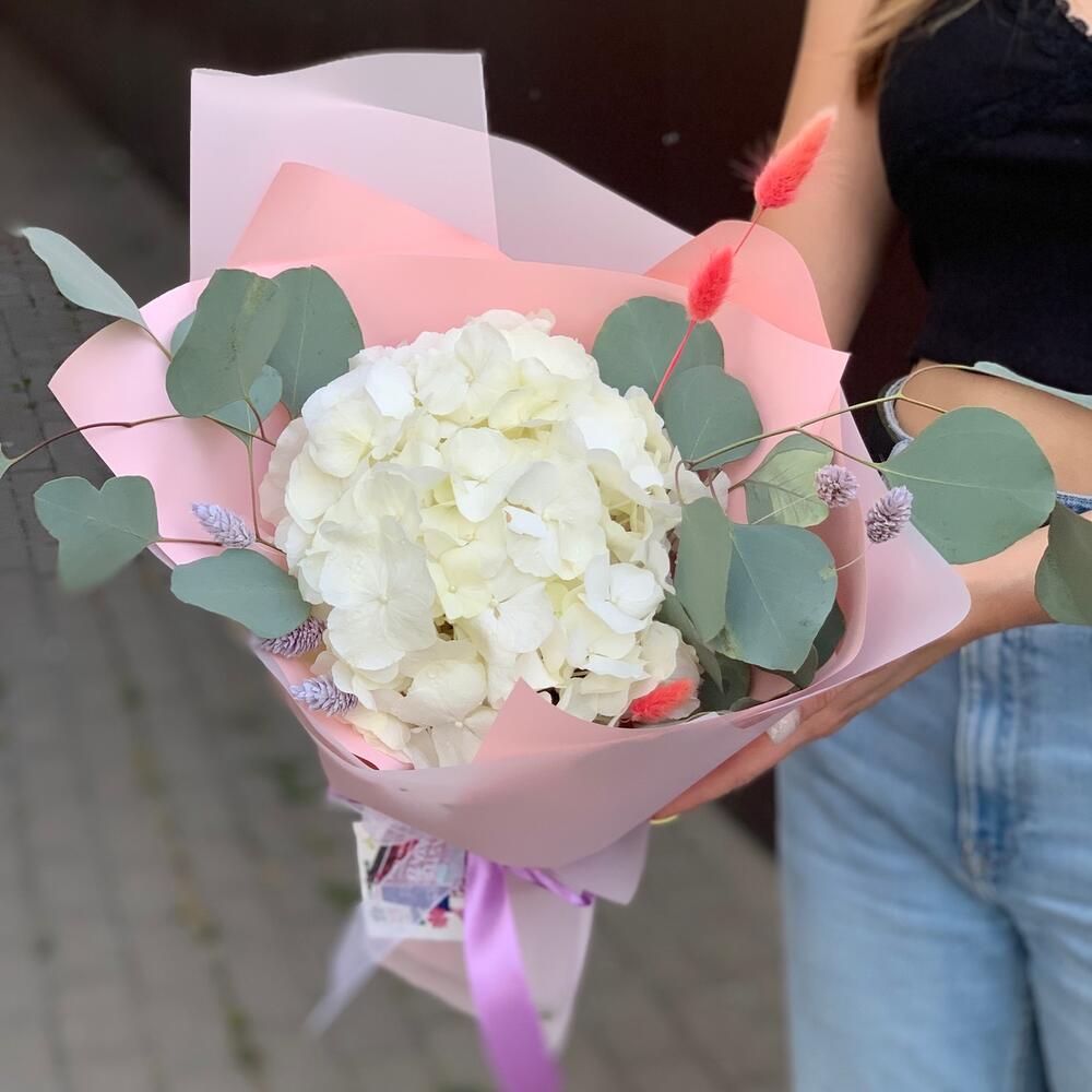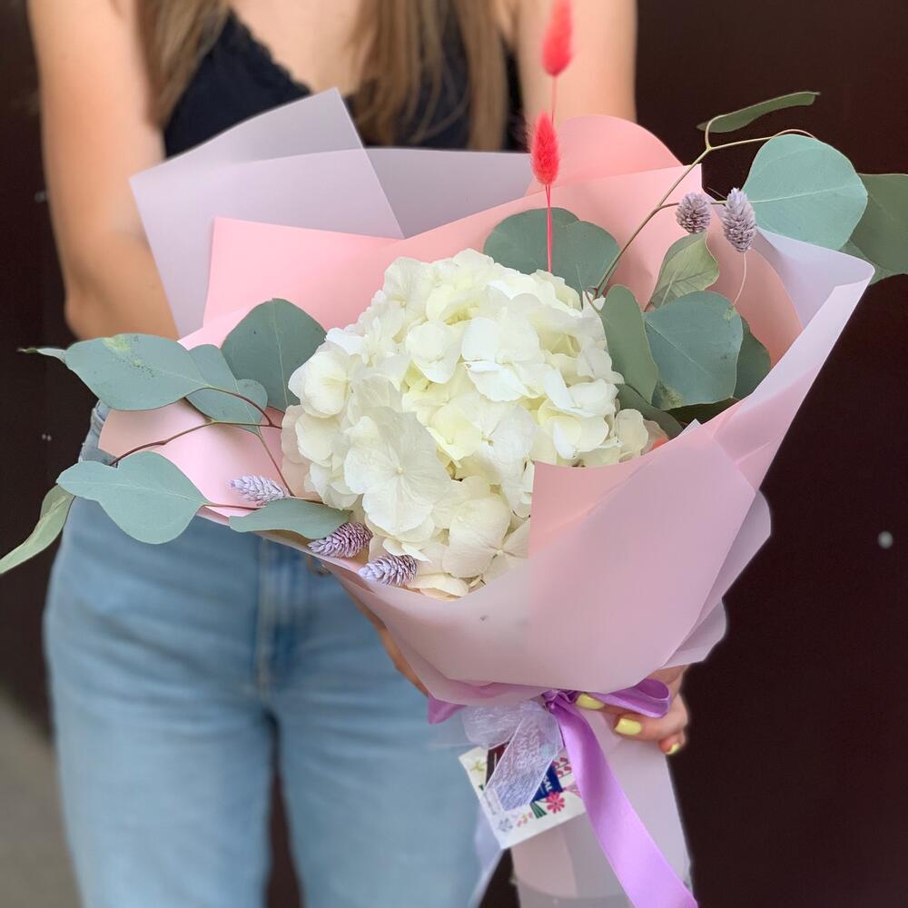Нежное облачко гортензии, дополненное сухоцветами и ароматным эвкалиптом