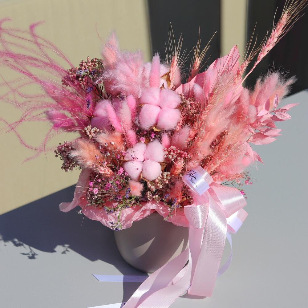 Гипсофила – 1 шт.Озотамнус – 4 шт.Хлопок – 5 шт.Пальма – 1 шт.Колосья – 10 шт.Лагурус – 17 шт.Сетария – 2 шт.Кашпо керамическое – 1 шт.Открыточка с вашими пожеланиями – 1 шт.Шоколадка – 1 шт.Стифа – 1 шт.