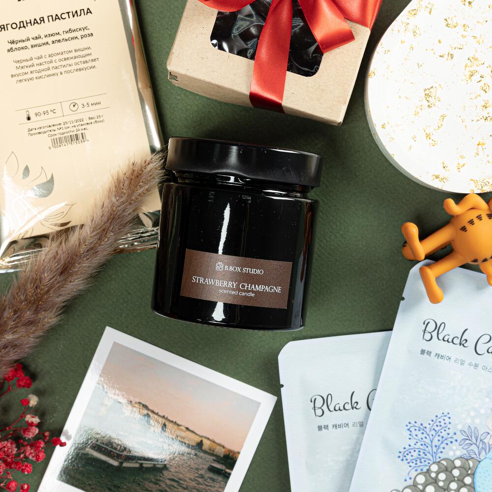 декоративная подставка для украшений из гипсофила – 1 шт.брендовая свеча bbox.studio с деревянным фитилем – 1 шт.парный брелок для ключей (цвет в ассортименте) – 2 шт.коробочка орехов в шоколаде – 1 шт.чай кантата – 1 шт.тканевая маска для лица – 1 шт.букет из сухоцветов – 1 шт.