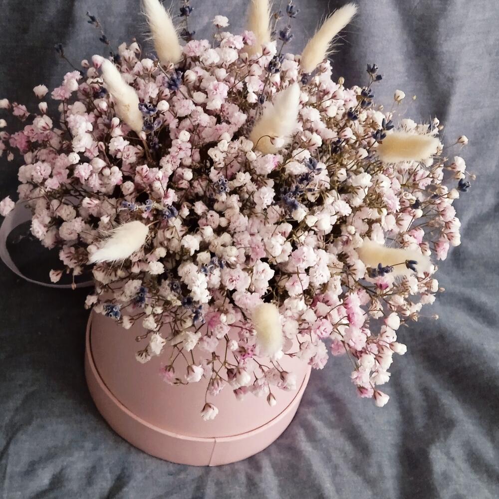 Розовая гипсофила в шляпной коробке М