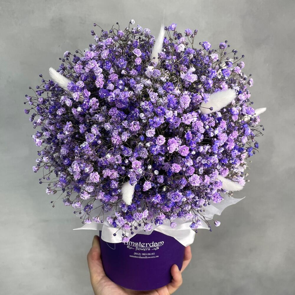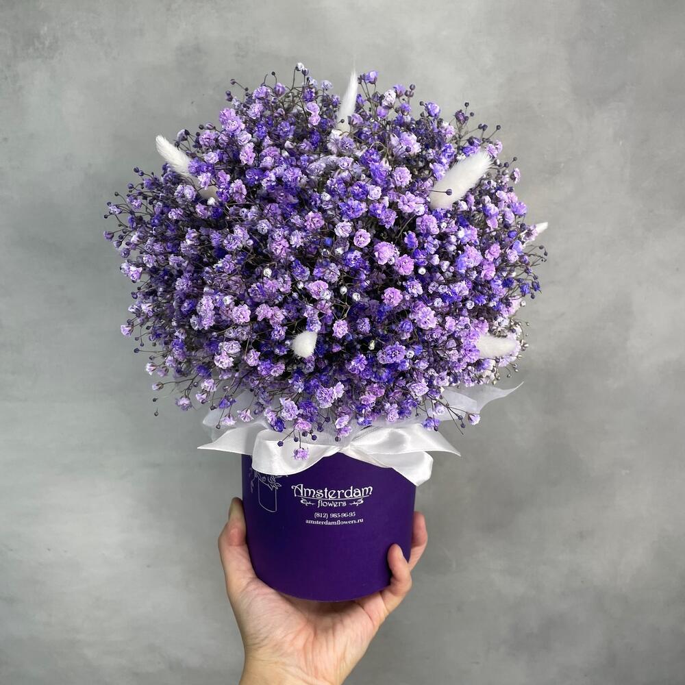 Гипсофила – 7 шт.Оазис – 1 шт.Коробка d12 – 1 шт.Лагурус (сухоцвет) – 11 шт.