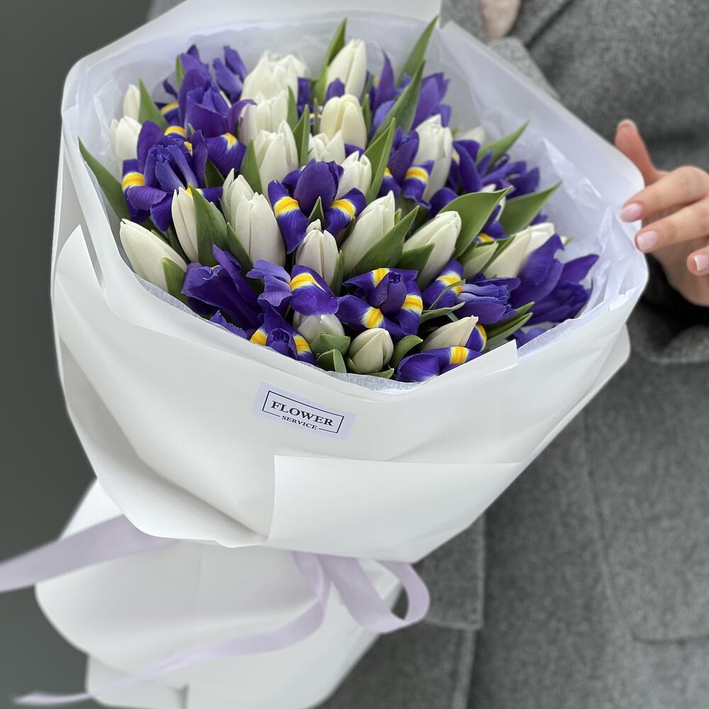 Букет из белых тюльпанов и синих ирисов!