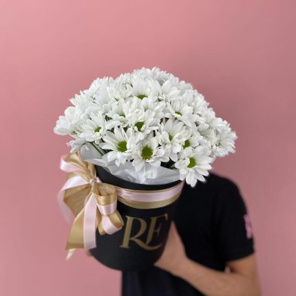 Хризантемы и Пионовидные кустовые розы в коробке + открытка ручной работы в подарок